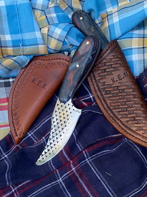 Ken was a wonderful grandfather that farmed and did carpentry work. His granddaughter wanted a legacy knife that incorporated a few of his shirts. We were able to incorporate Ken in a number of different ways in these legacy knives.