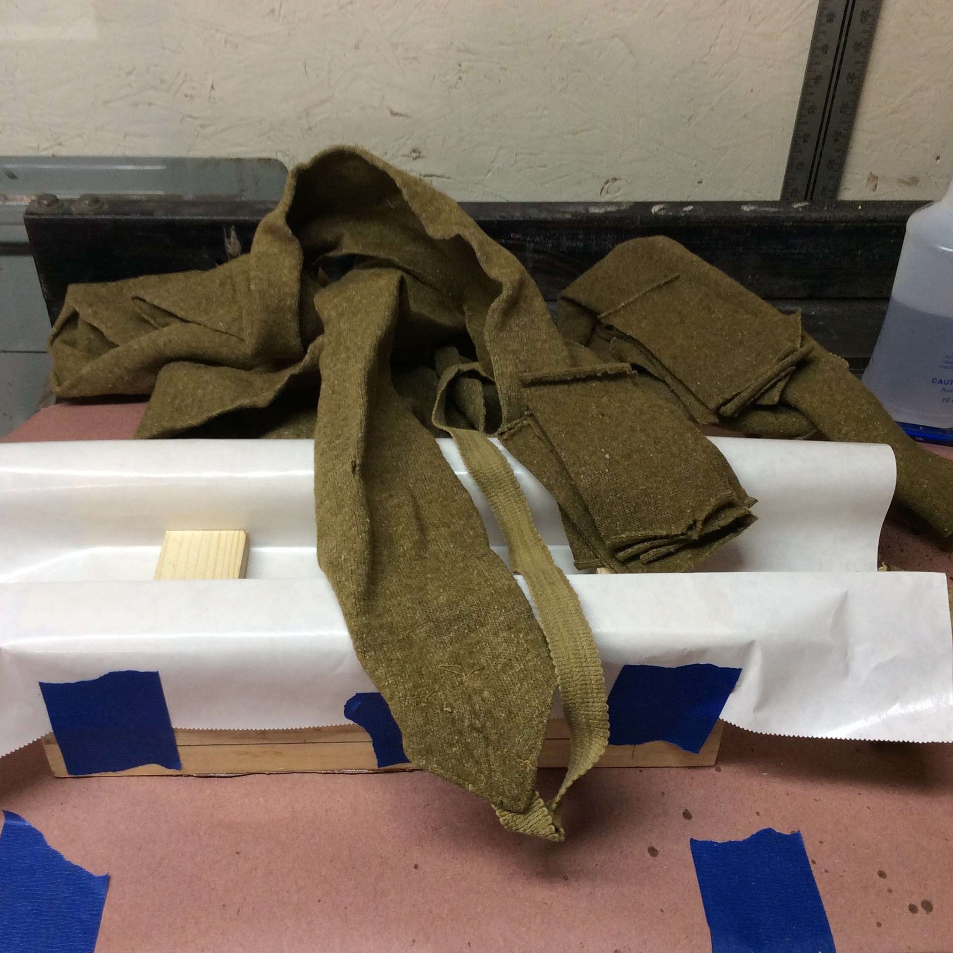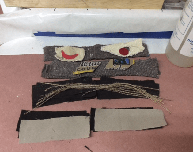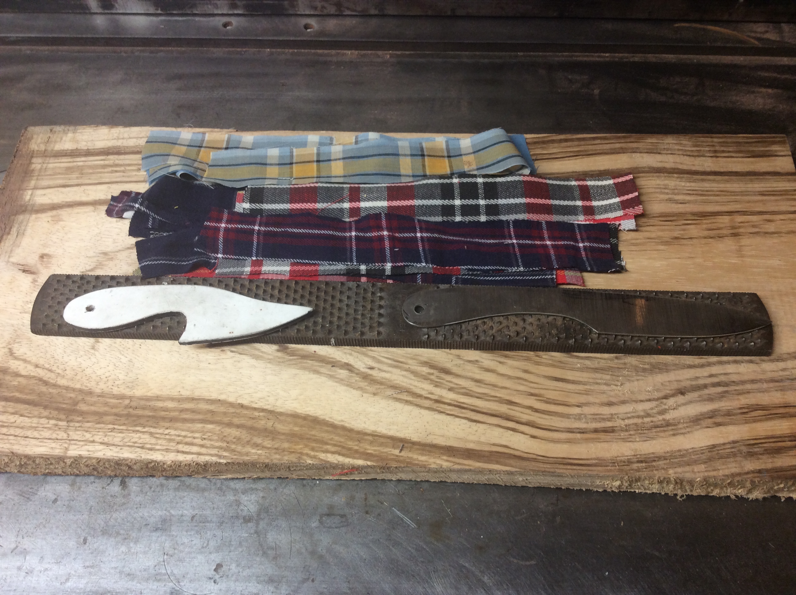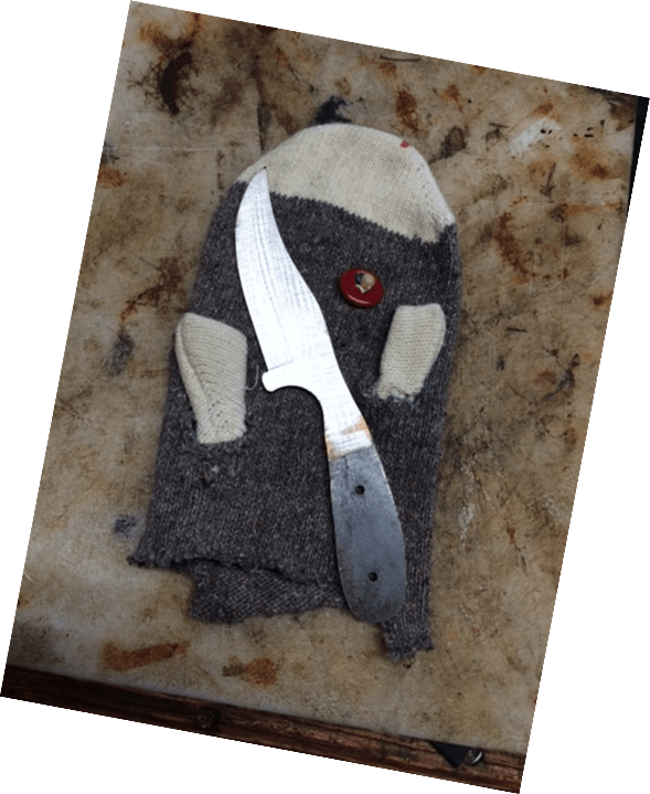 Choose the item that you want incorporated into the handle of the knife. Get creative! Material works best but we can incorporate some hard items (like the eye from this sock monkey). You can use a shirt, pants, hat, blanket, apron….and the list goes on. You can choose one item or multiple items from multiple loved ones to incorporate into the handle.