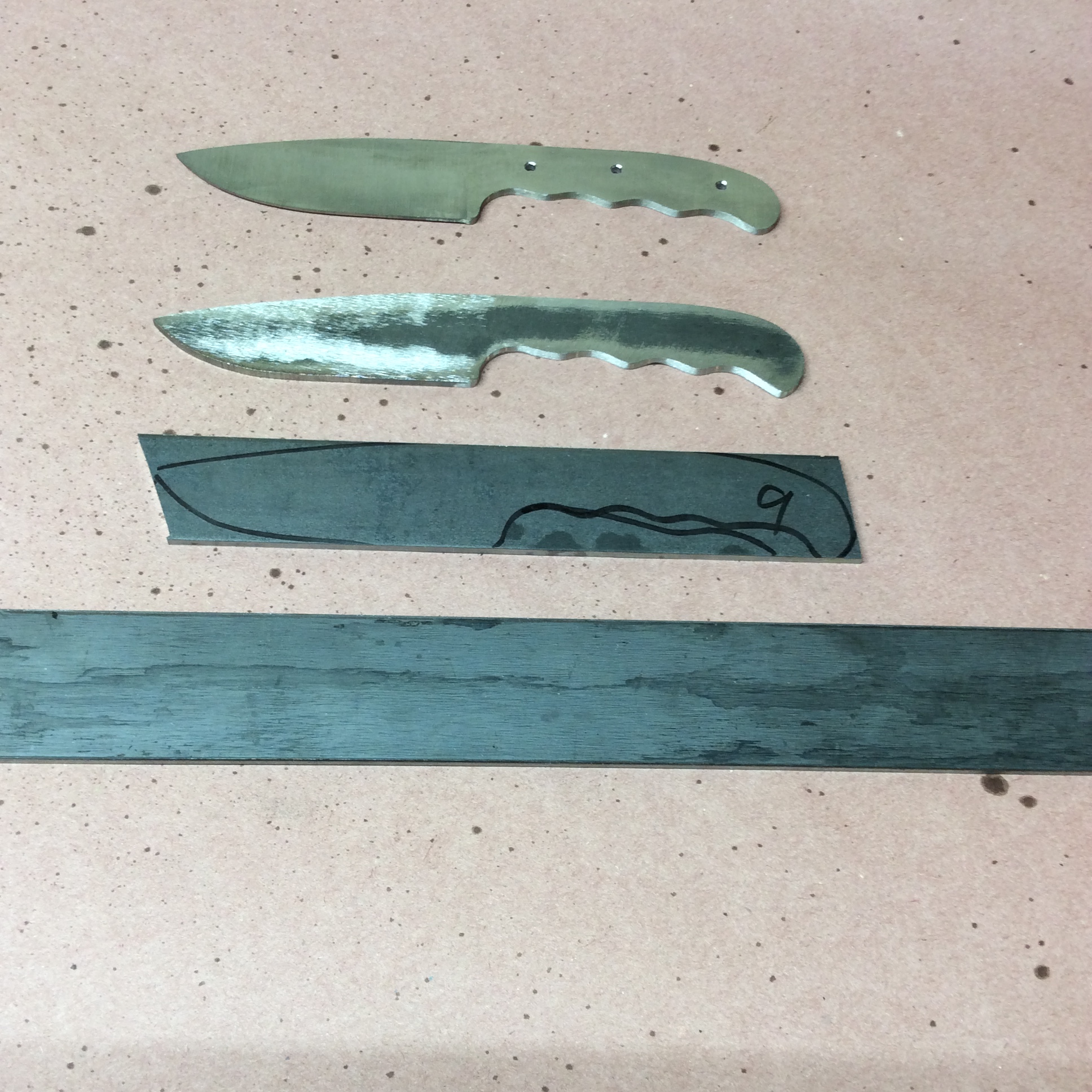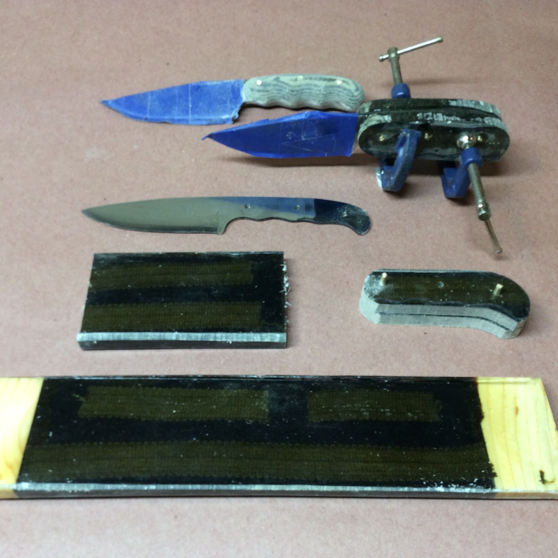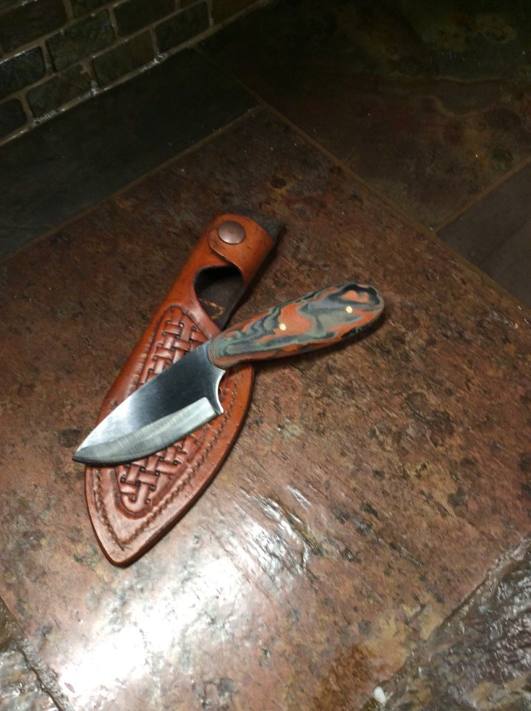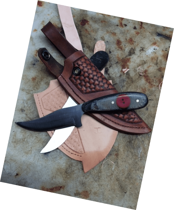 The knife making and sheath making process begin. After many layers, shaping, sanding and a few prayers, the knife and sheath are ready to be sent to you. Yes, that is the eye of the sock monkey incorporated into the knife handle.