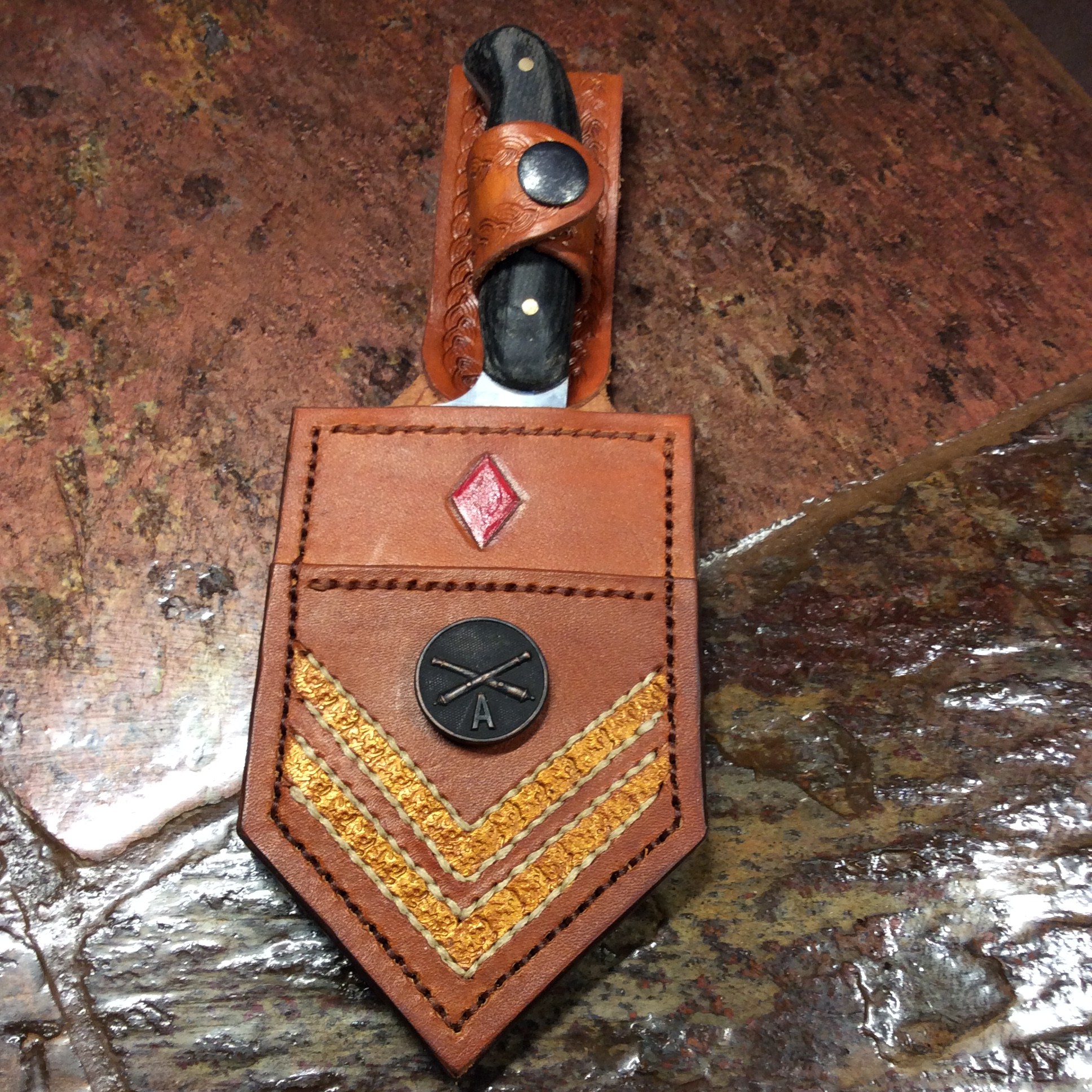 THE first memory knife that inspired the process. Grandpa Mann served in World War I in the Red Arrow Division. This knife handle was made using portions of his uniform and the sheath was made to mimic the uniform, stripes and the “red arrow” that the division was known for.