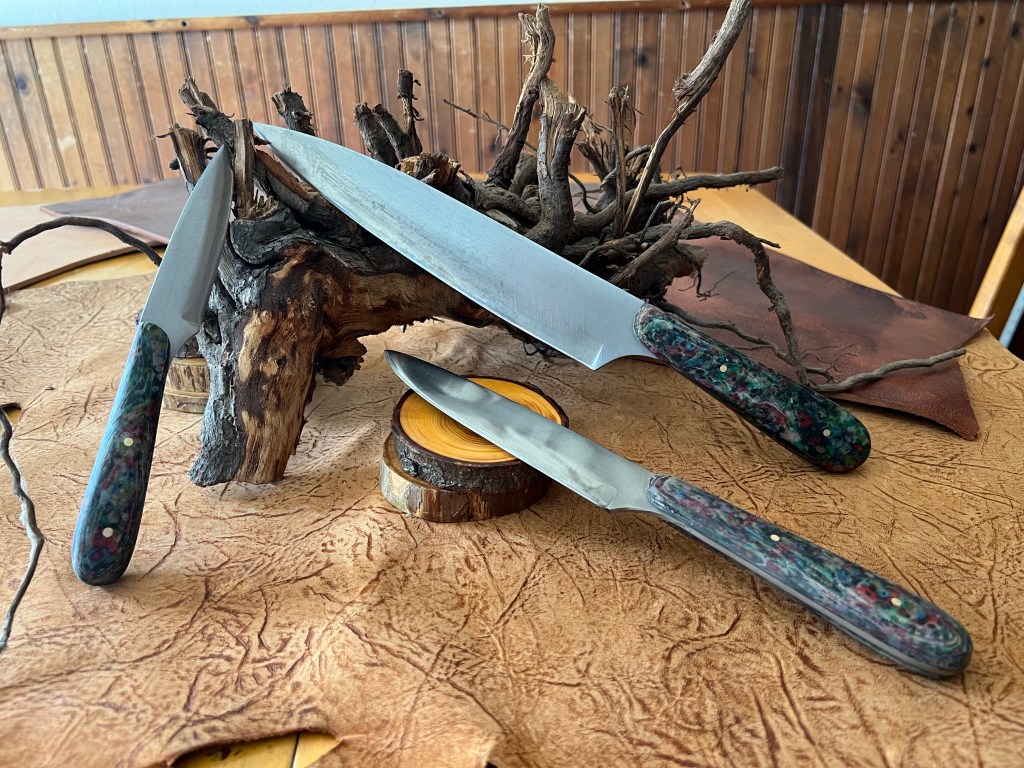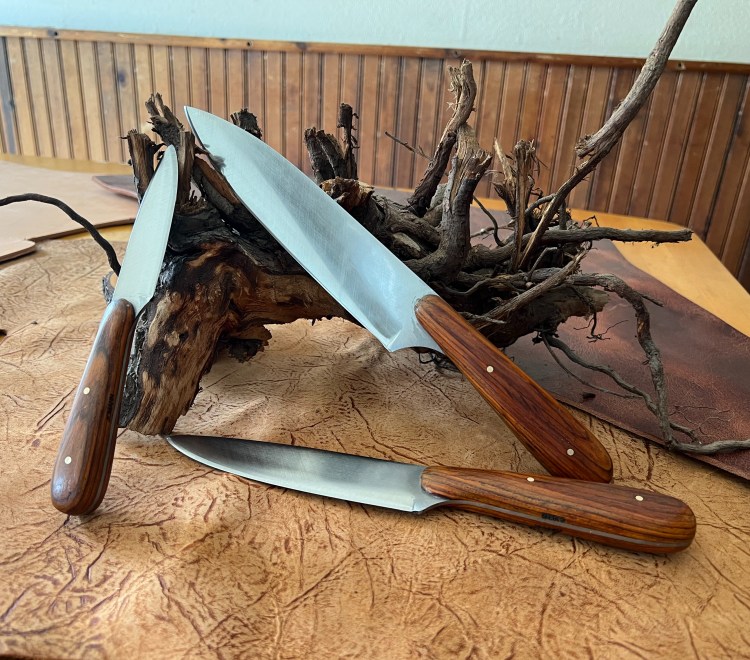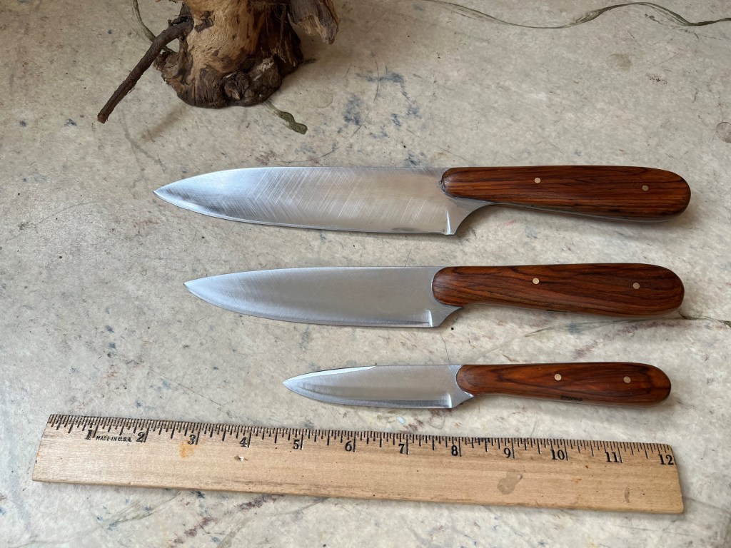 Kitchen sets come with 3 knives. The first has an 8 inch blade and can be purchased separately for $65.00 + s&h. The second has a 5 1/2 inch blade and can be purchased separately for $55.00 + s&h. The third knife has a 3 inch blade and can be purchased separately for $45.00 + s&h. All knives are made of 1095 steel and the handle is Cocobolo wood.