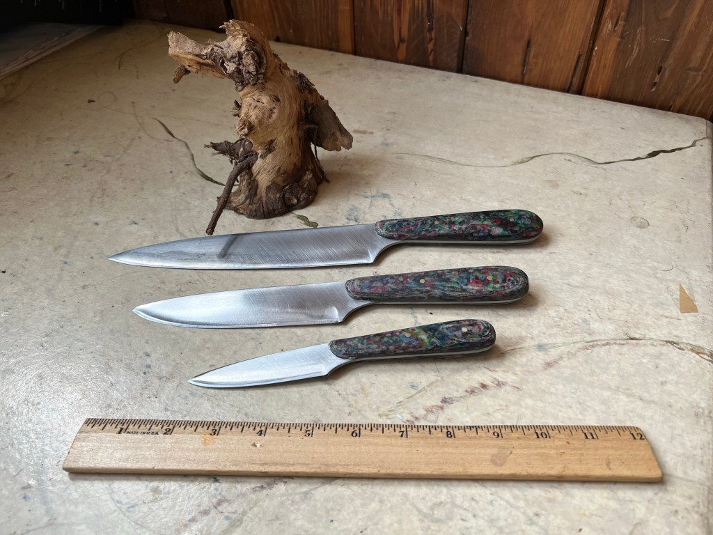 Kitchen sets come with 3 knives. The first has an 8 inch blade and can be purchased separately for $65.00 + s&h. The second has a 5 1/2 inch blade and can be purchased separately for $55.00 + s&h. The third knife has a 3 inch blade and can be purchased separately for $45.00 + s&h. All knives are made of 1095 steel and have a composite handle.