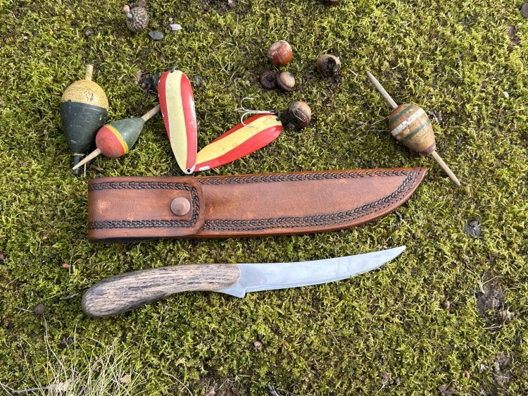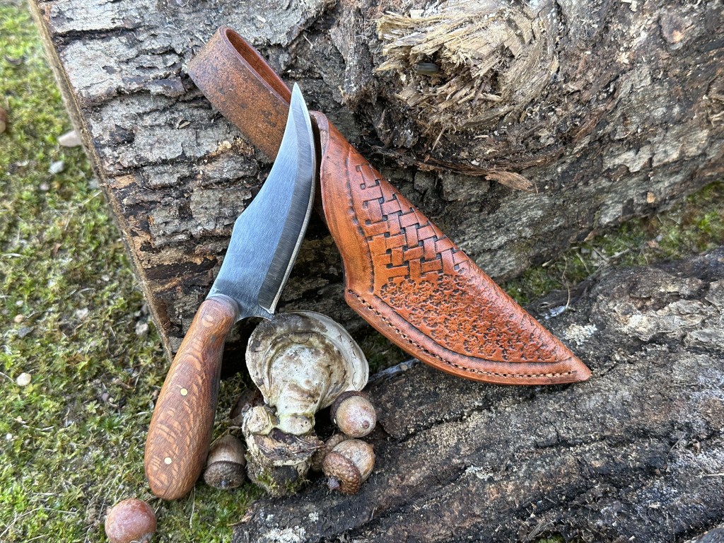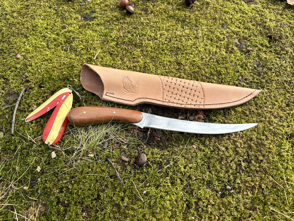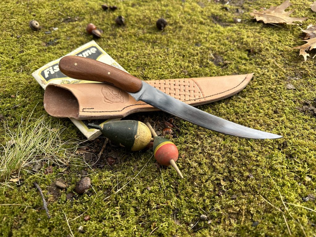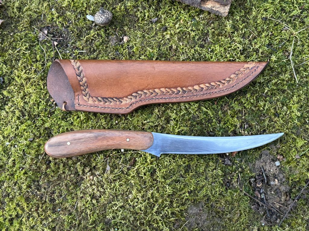 Filet Knife with a total length of 9.5 inches with a 5.5 inch blade. The blade is 1095 steel and the handle is Oak Wood.
